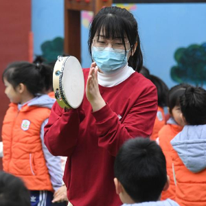 在北京大学医学部幼儿园,老师与孩子们一起做融合支持性游戏“马兰花”(3月27日摄)。