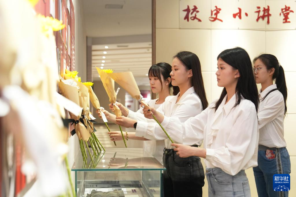 4月3日,在重庆市西南大学校史馆“校史英雄烈士专题展厅”,学生代表向红岩英烈献花。