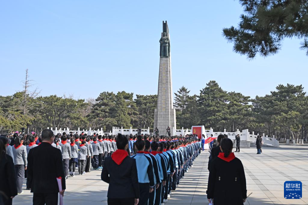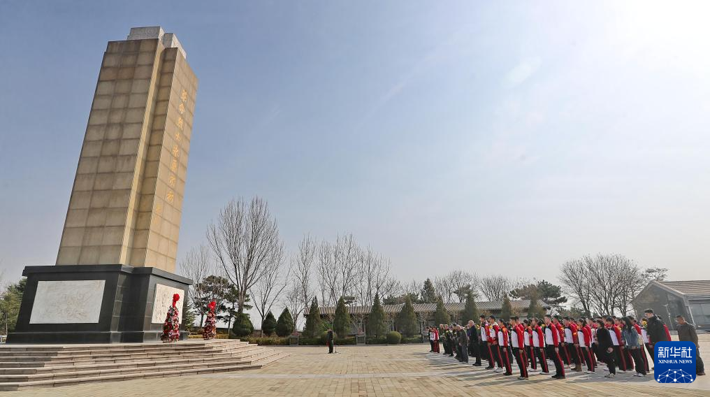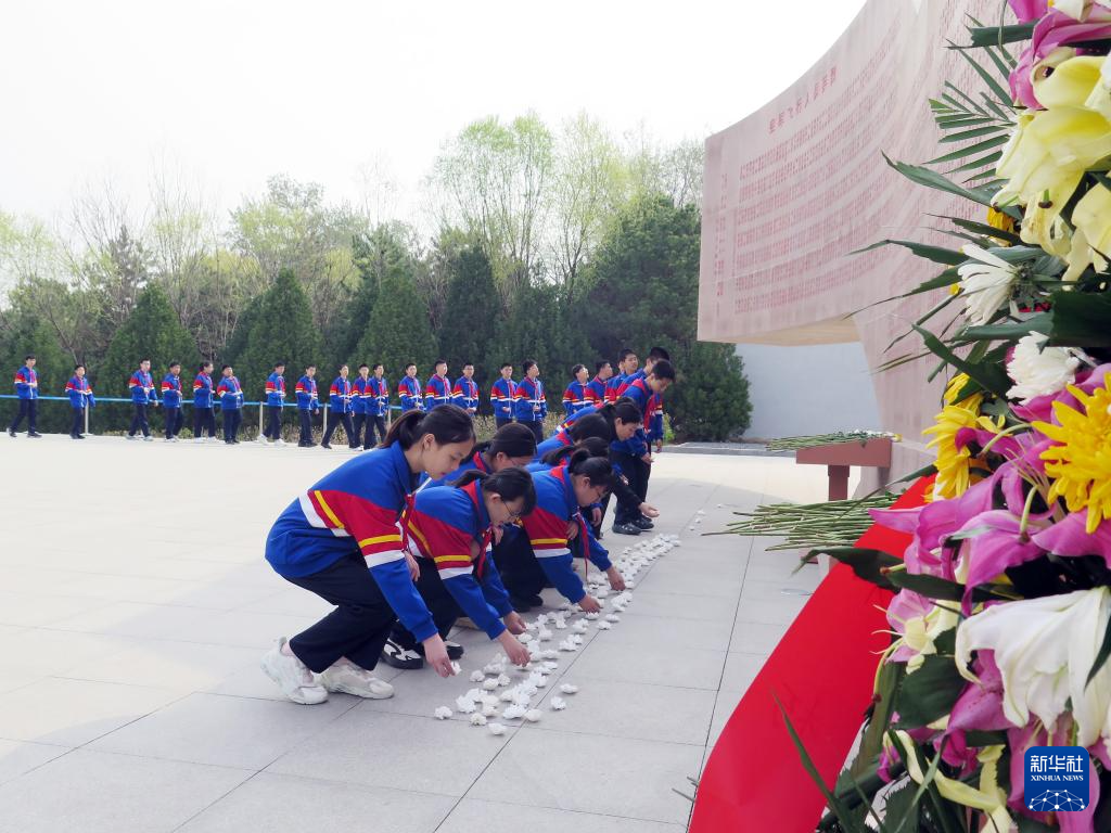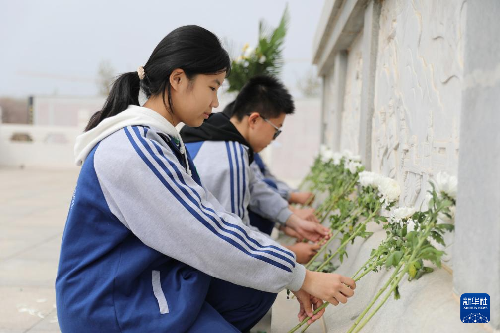 4月1日,山东省乐陵市开元中学学生在冀鲁边区革命纪念园烈士纪念碑前敬献鲜花。