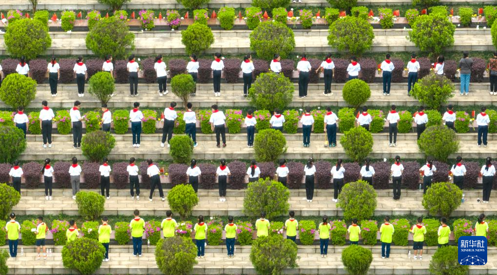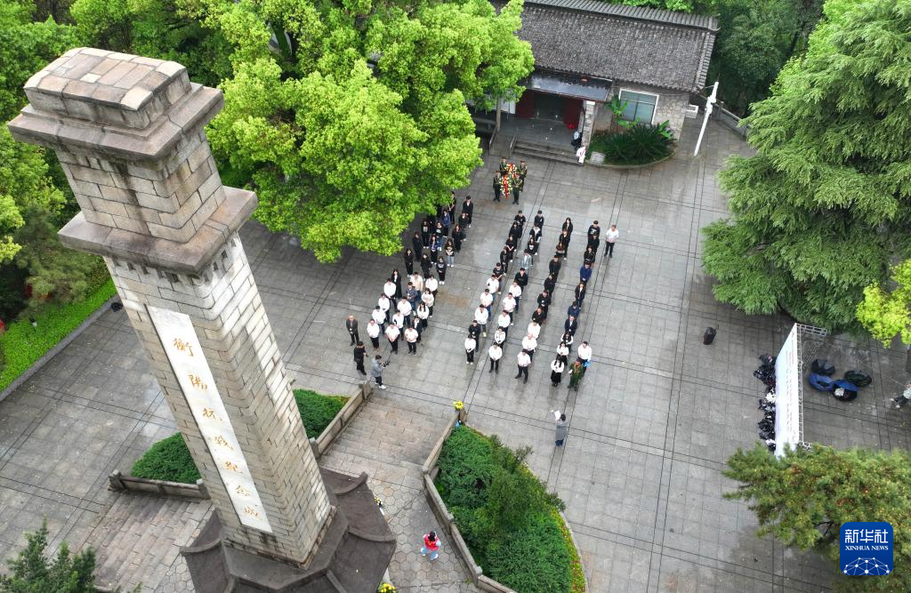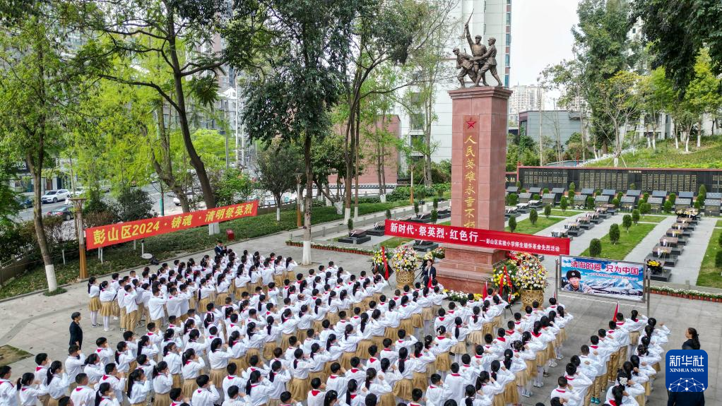 4月1日,四川省眉山市彭山区实验小学师生在烈士陵园祭奠英烈(无人机照片)。