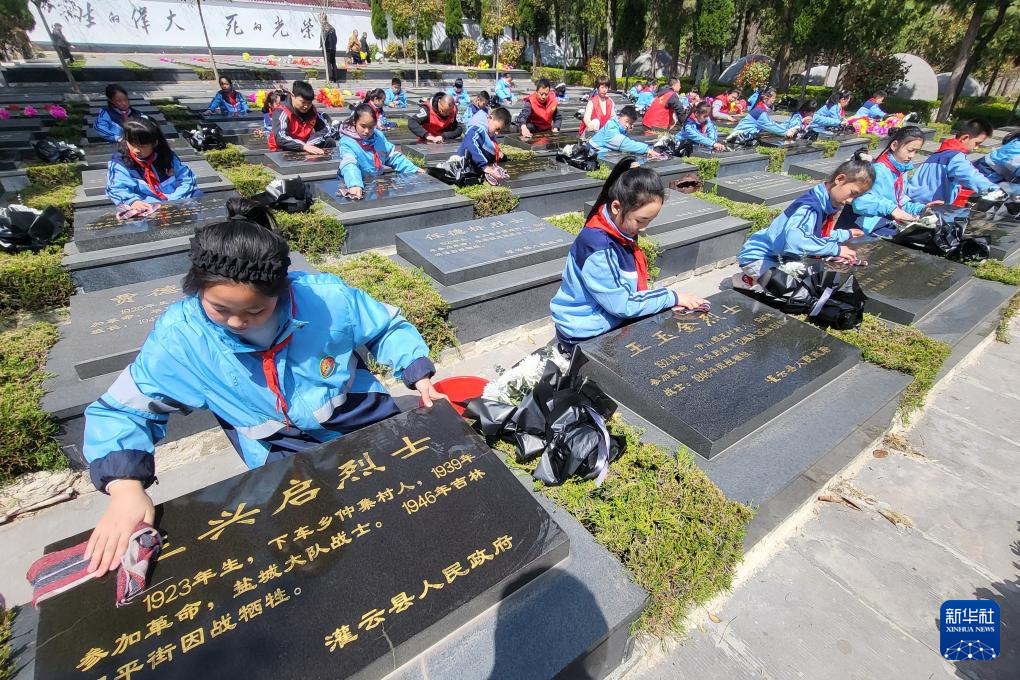 4月1日,少先队员在江苏省连云港市灌云县烈士陵园擦拭陵碑。