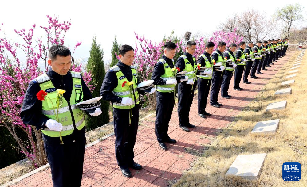 4月1日,山东省枣庄市公安局市中分局交通警察大队民警、辅警在天马山烈士陵园祭奠英烈。