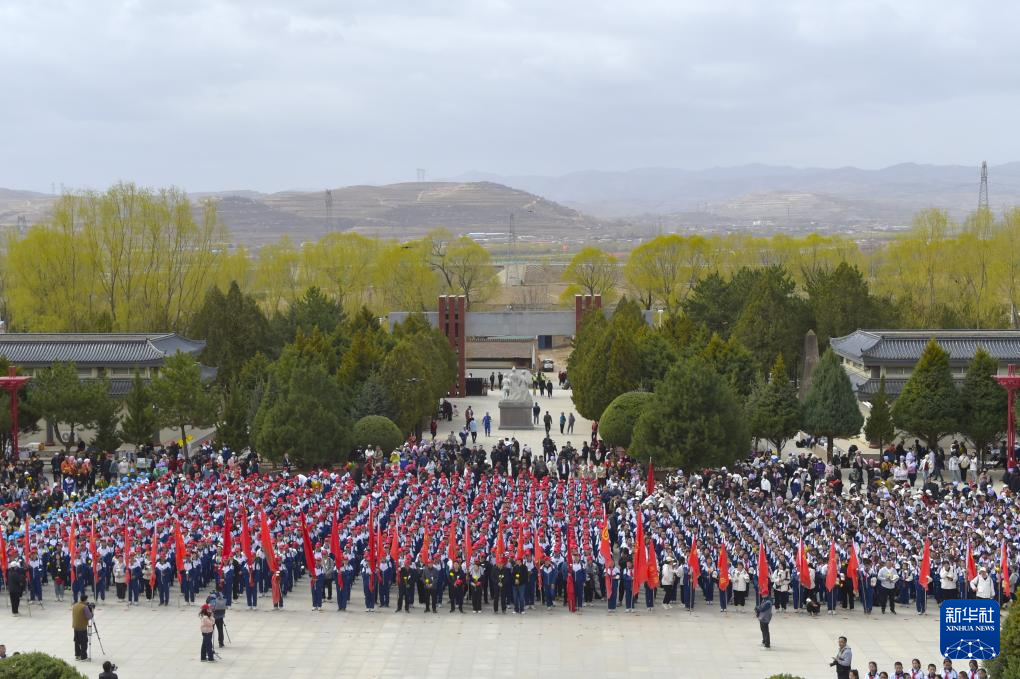 这是4月3日在宁夏固原市任山河烈士陵园拍摄的祭奠革命英烈活动现场。