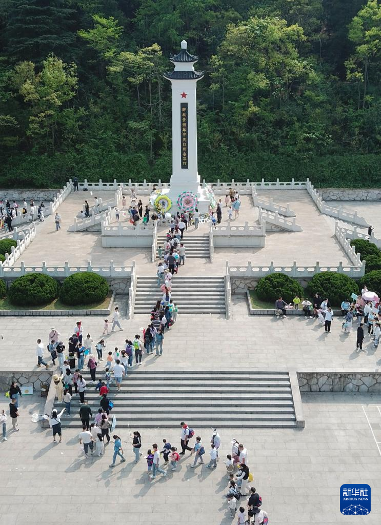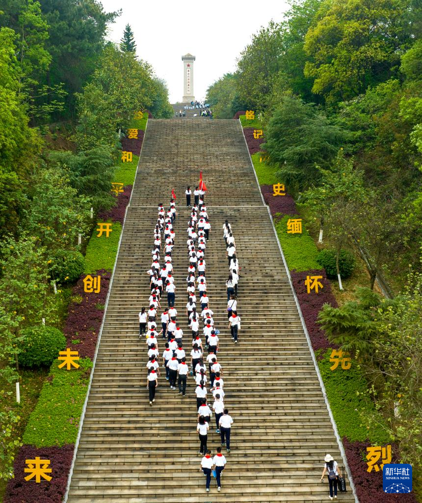 4月3日,人们在贵州省贵阳市黔灵山公园解放贵州革命烈士纪念碑广场缅怀先烈(无人机照片)。