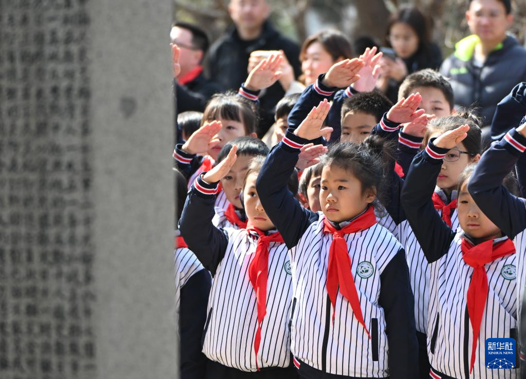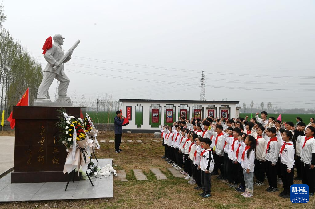 4月3日,在河南省沁阳市西万镇留庄村李文彦烈士文化广场,少先队员在李文彦烈士雕像前宣誓。