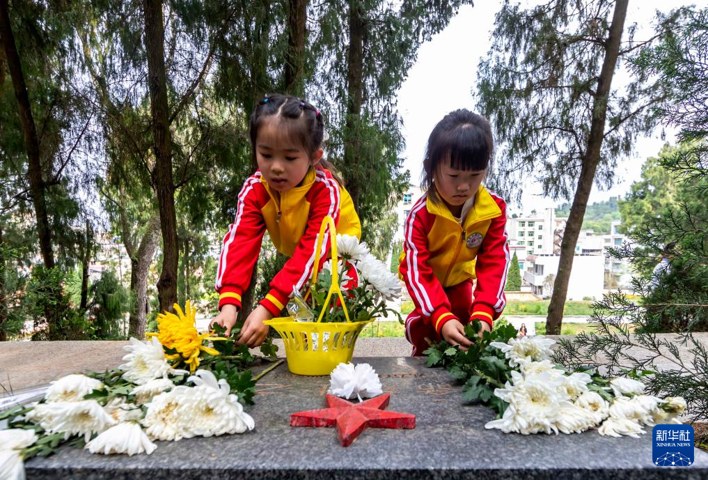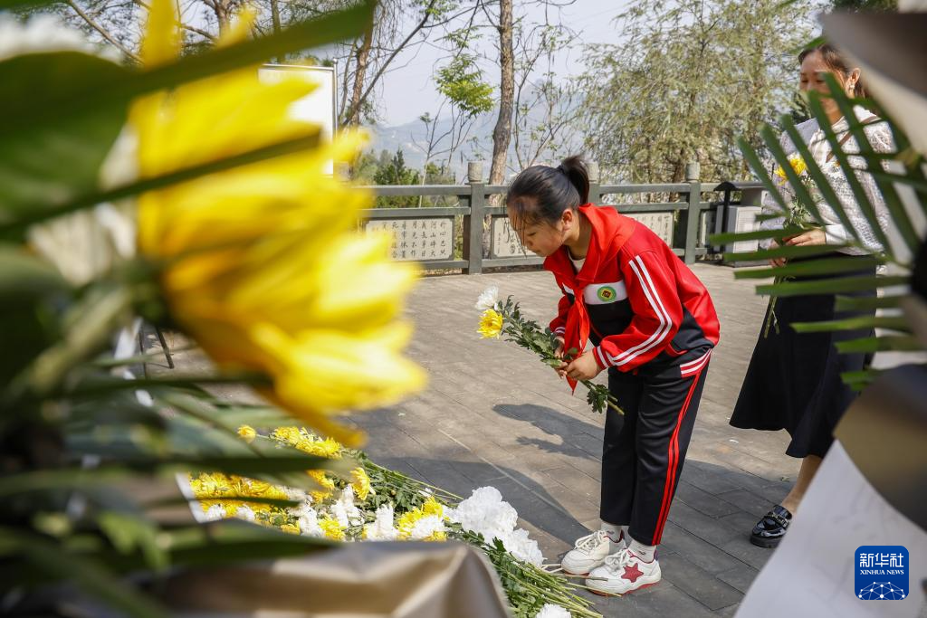 4月3日,学生在贵州省黔南布依族苗族自治州罗甸县烈士陵园向烈士敬献鲜花。