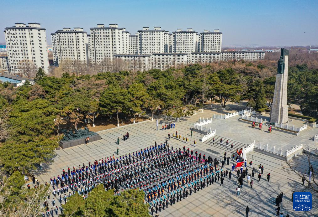 这是4月2日在沈阳抗美援朝烈士陵园拍摄的“青春沈阳、传承荣光——沈阳少先队2024·铸魂·清明祭英烈”特别主题队日活动现场(无人机照片)。