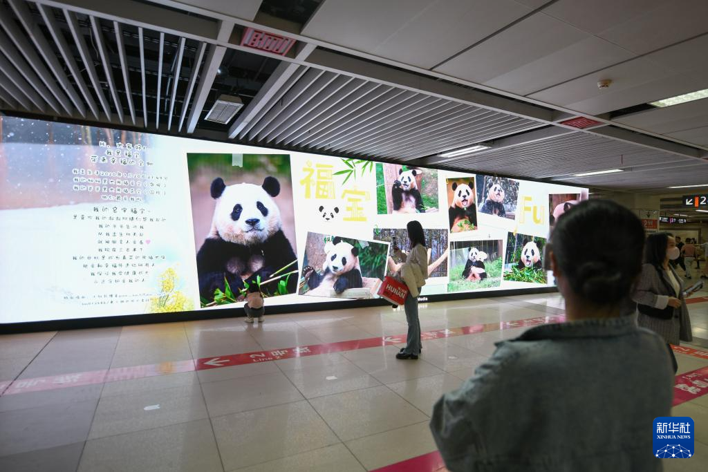 4月3日晚,旅韩大熊猫“福宝”搭乘包机抵达成都双流国际机场。这是当日市民在成都春熙路地铁站内拍摄大熊猫“福宝”应援灯箱。