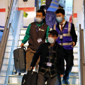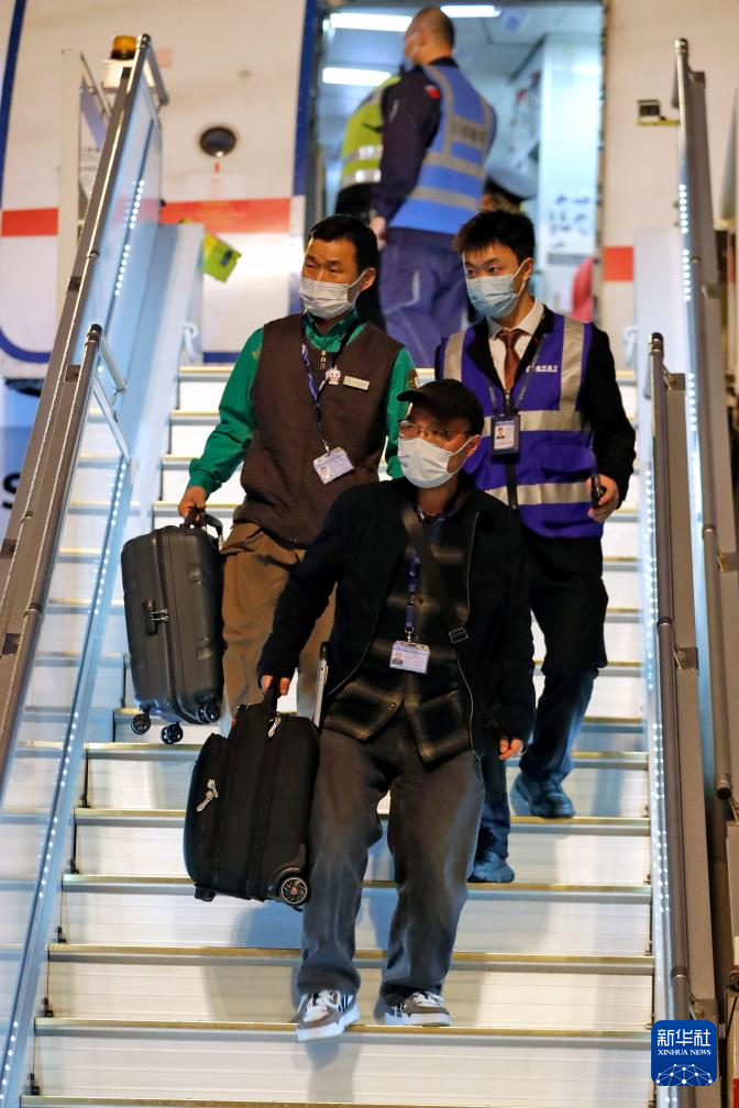 4月3日晚,旅韩大熊猫“福宝”搭乘包机抵达成都双流国际机场。“福宝”的韩国饲养员姜哲远(左一)随“福宝”一同抵达。