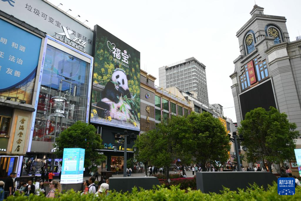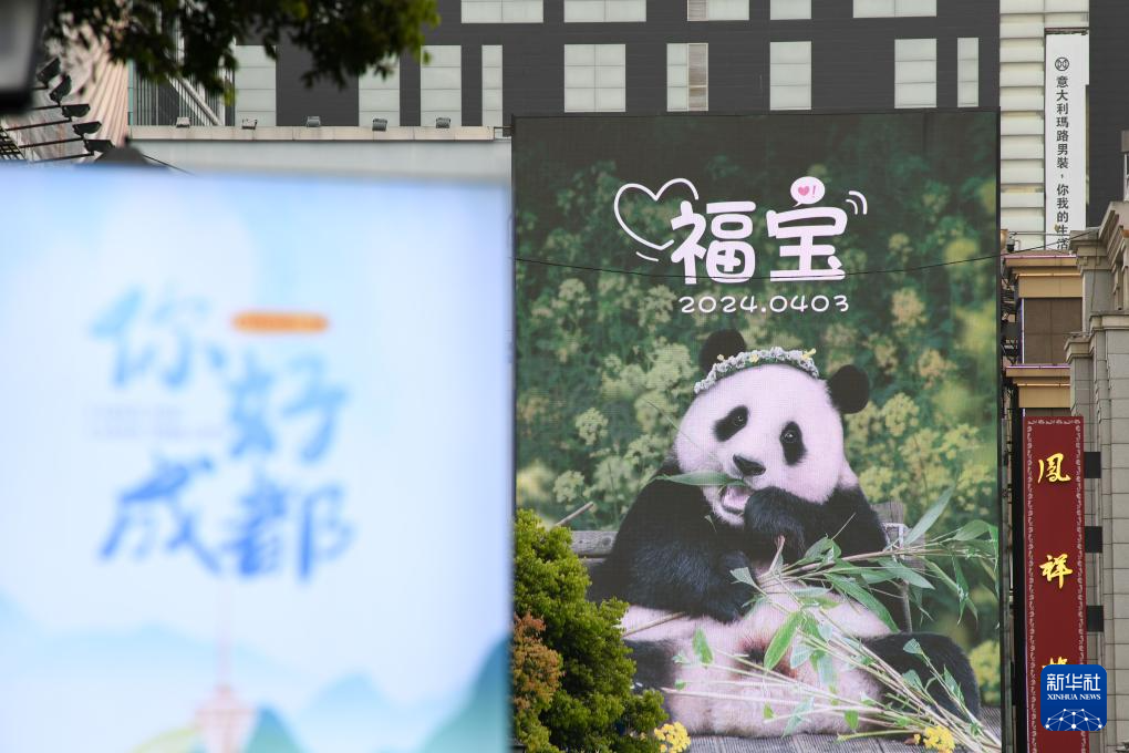 4月3日晚,旅韩大熊猫“福宝”搭乘包机抵达成都双流国际机场。这是当日在成都春熙路步行街上拍摄的大熊猫“福宝”应援屏幕。