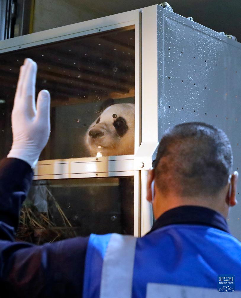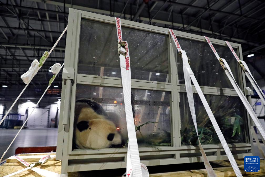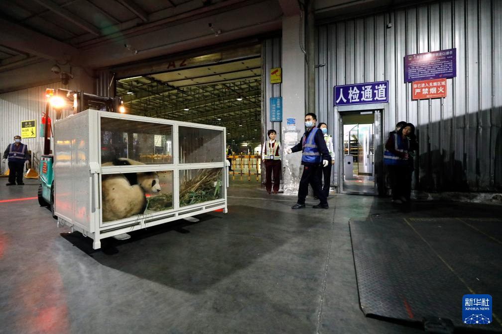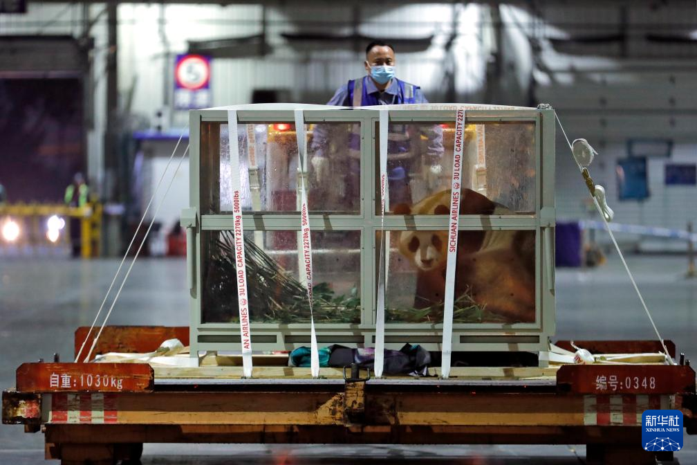 4月3日晚,旅韩大熊猫“福宝”搭乘包机抵达成都双流国际机场后,准备乘车前往中国大熊猫保护研究中心神树坪基地进行隔离检疫。