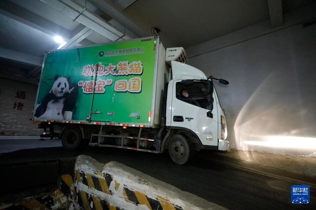 4月3日晚,旅韩大熊猫“福宝”搭乘包机抵达成都双流国际机场后,乘车前往中国大熊猫保护研究中心神树坪基地进行隔离检疫。