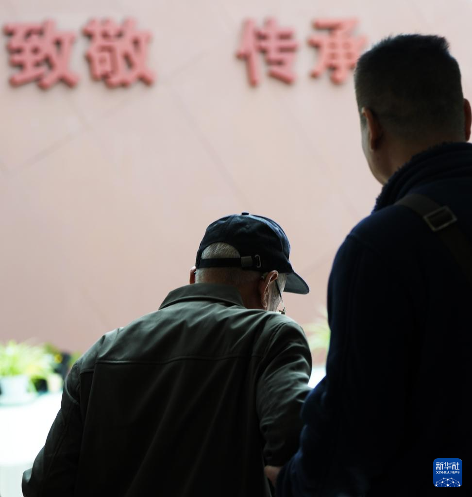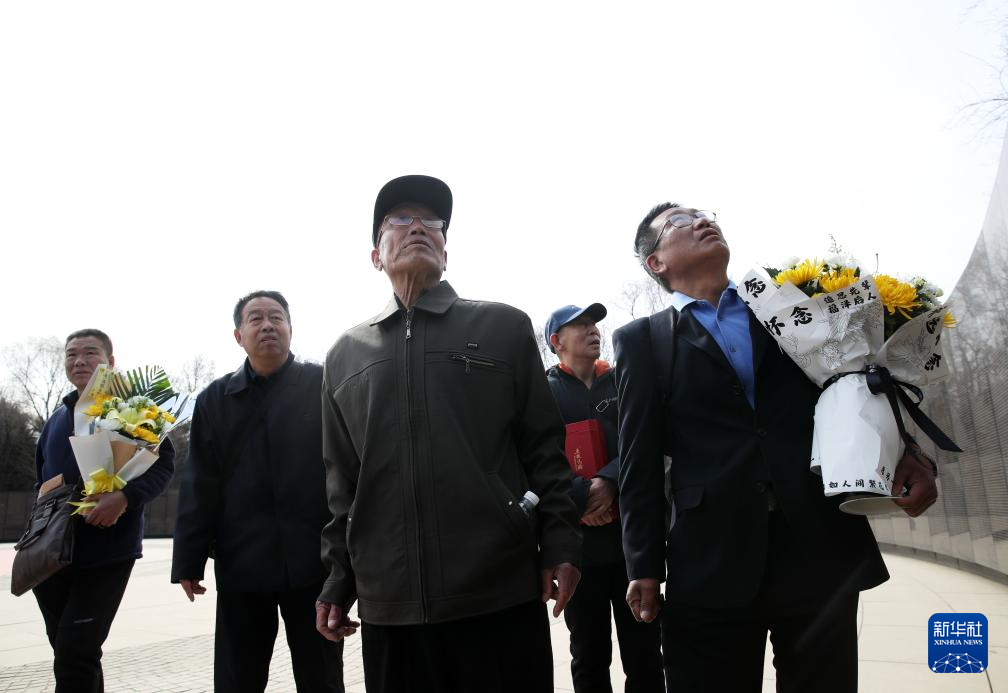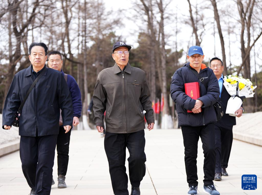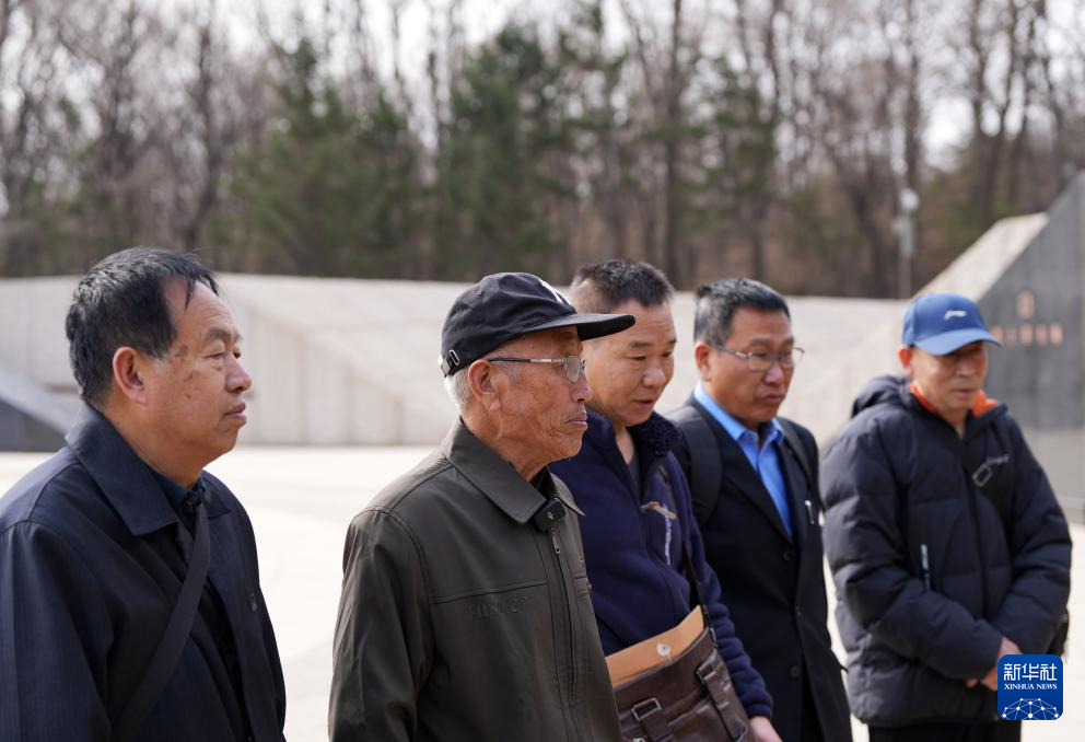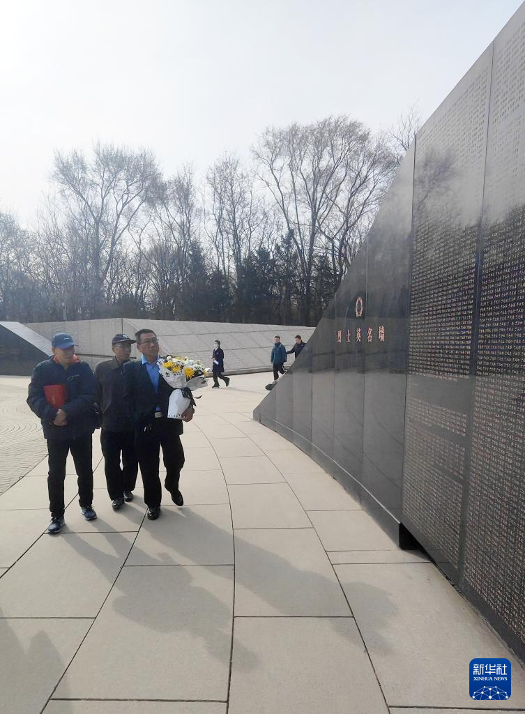 4月3日,在沈阳抗美援朝烈士陵园,史荣升(左二)等人在瞻仰烈士英名墙。