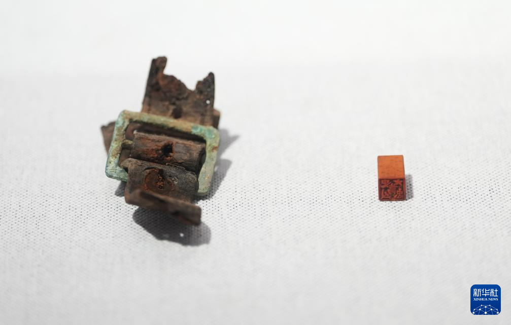 史万忠烈士遗物展柜里的印章(右)和只剩下扣头的腰带(4月3日摄)。