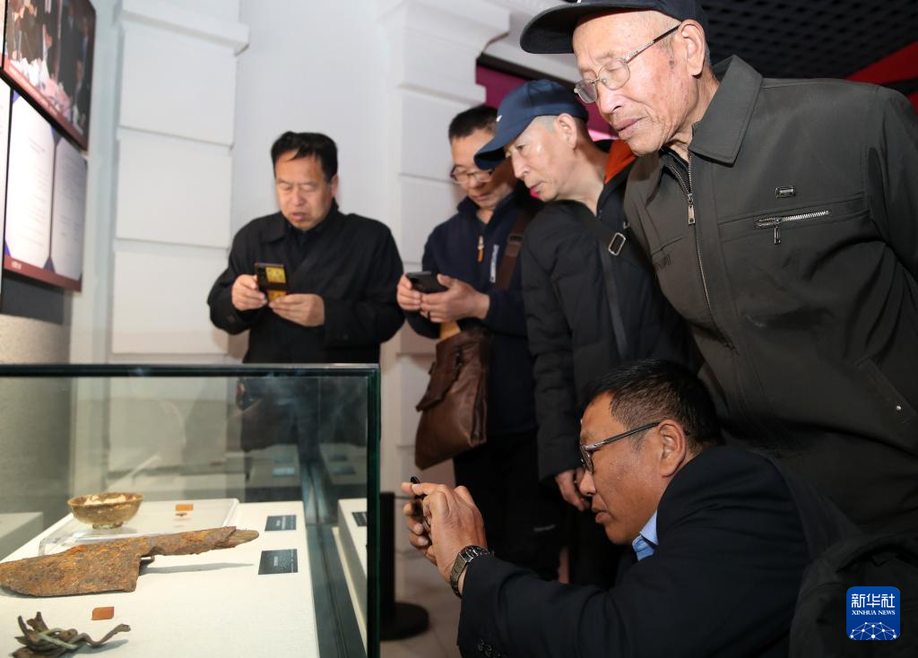 4月3日,在史万忠烈士遗物展柜前,史荣升(右一)等人瞻仰遗物。