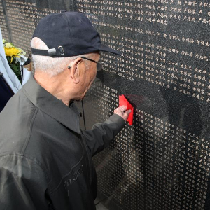 4月3日,在沈阳抗美援朝烈士陵园,史荣升老人手指轻触刻有父亲名字的烈士英名墙。