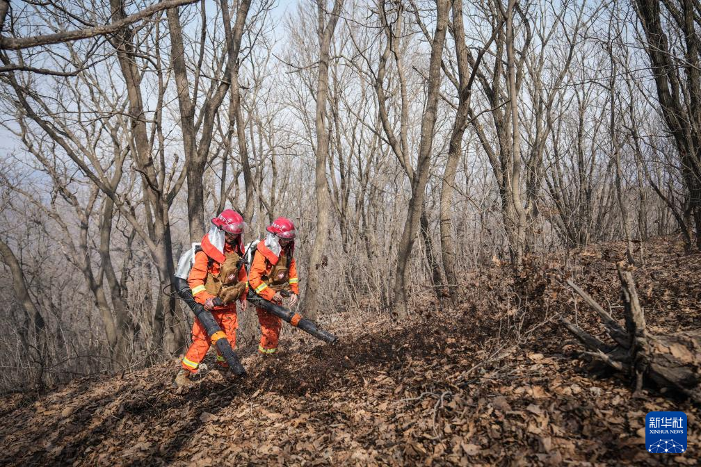 4月2日,本溪市森林消防队的消防员在明山区青云山使用风力灭火机辟出防火隔离带。