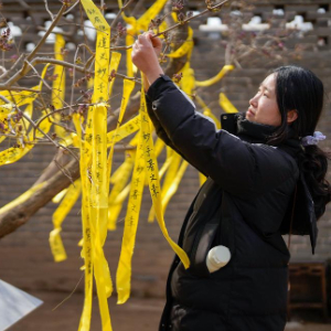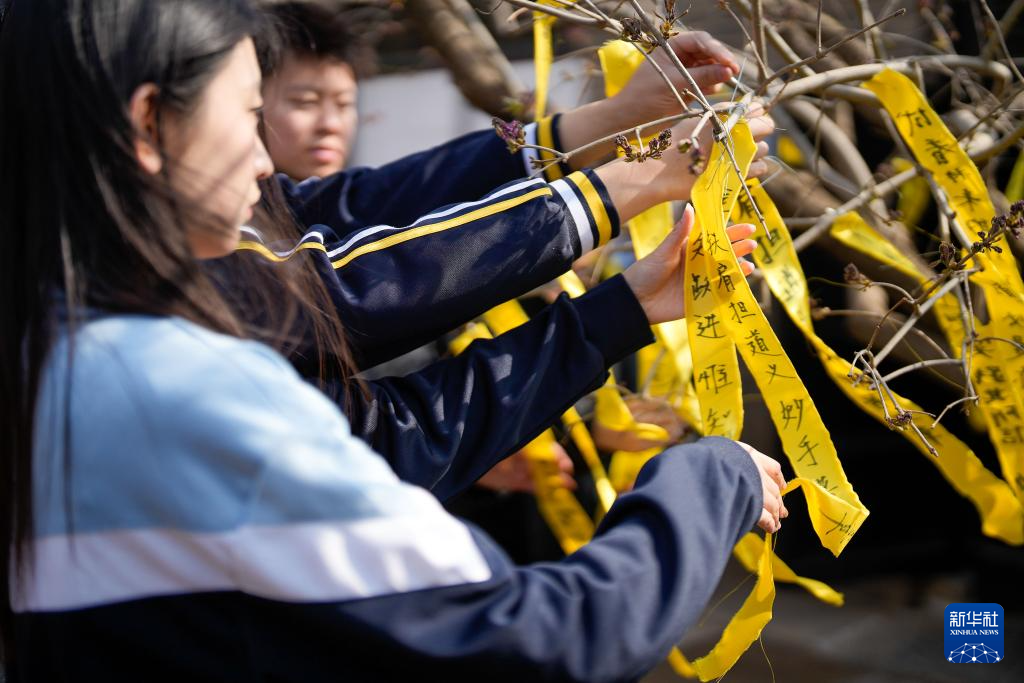 4月4日,一名女士将寄托哀思的黄丝带绑在李大钊故居内的丁香树上。