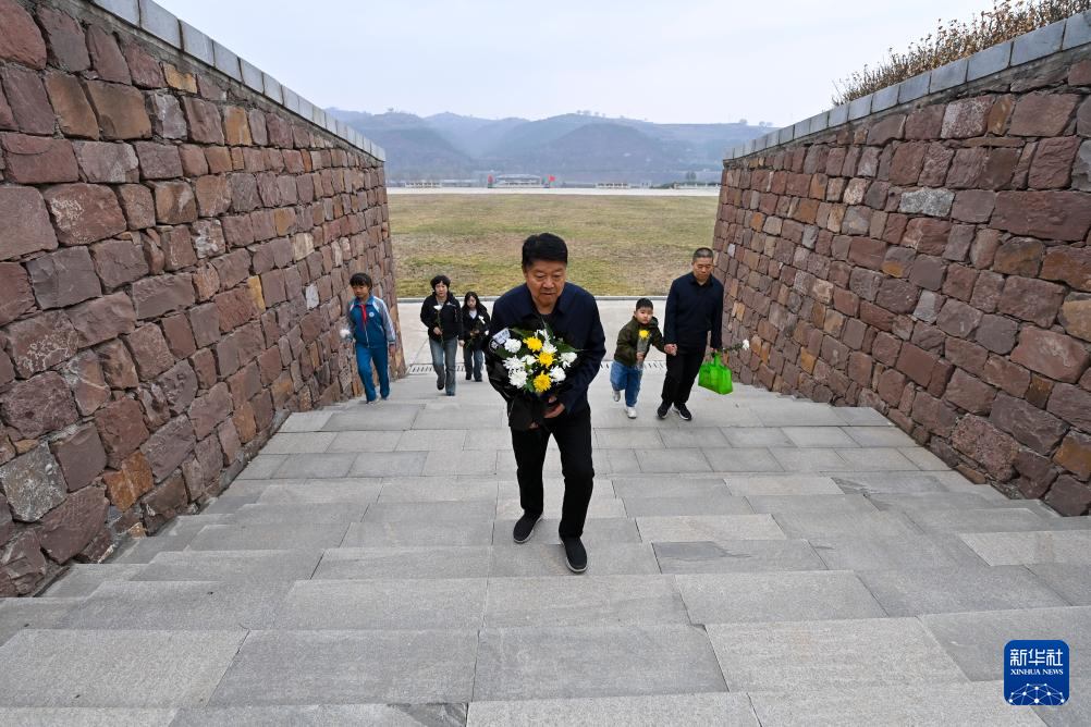 4月3日,在位于武乡县里庄村的八路军烈士陵园,梁效珍的重外孙杨崇颢(左一)为烈士献花。