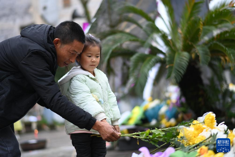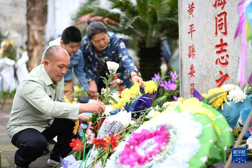 4月4日,石正祥(左)在贵州省黄平县旧州革命烈士陵园与烈属一起祭奠烈士。