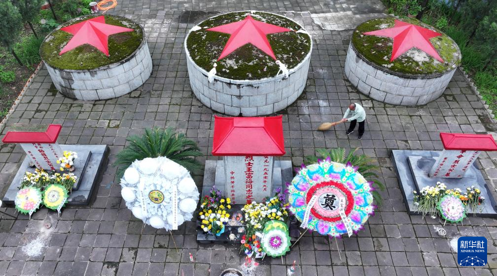 4月4日,石正祥在贵州省黄平县旧州革命烈士陵园打扫卫生(无人机照片)。
