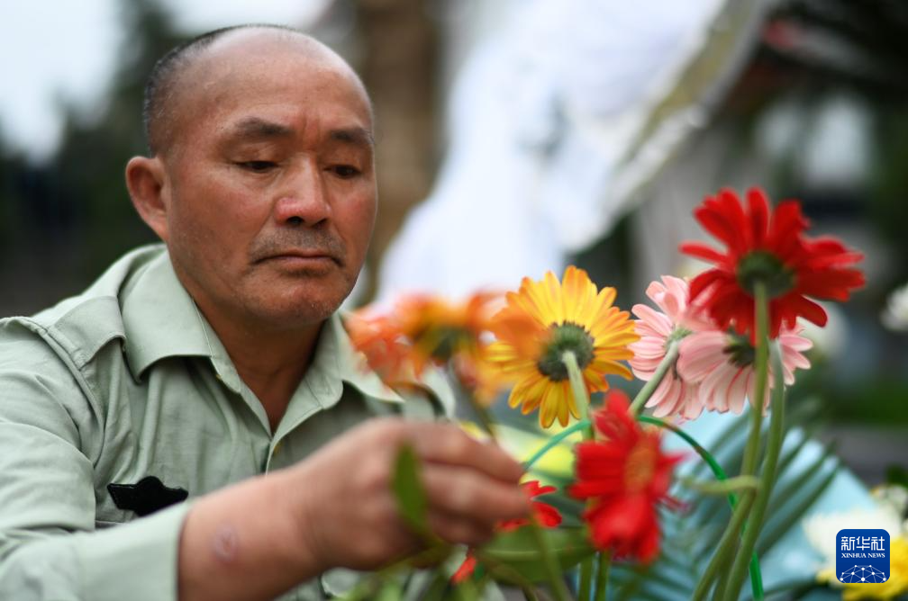4月4日,石正祥在贵州省黄平县旧州革命烈士陵园修整烈士墓前的鲜花。