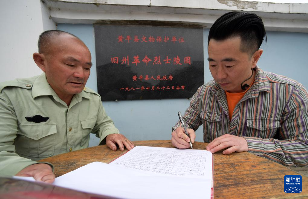4月4日,在贵州省黄平县旧州革命烈士陵园,石正祥(左)协助来陵园扫墓的烈属进行登记。