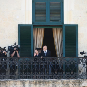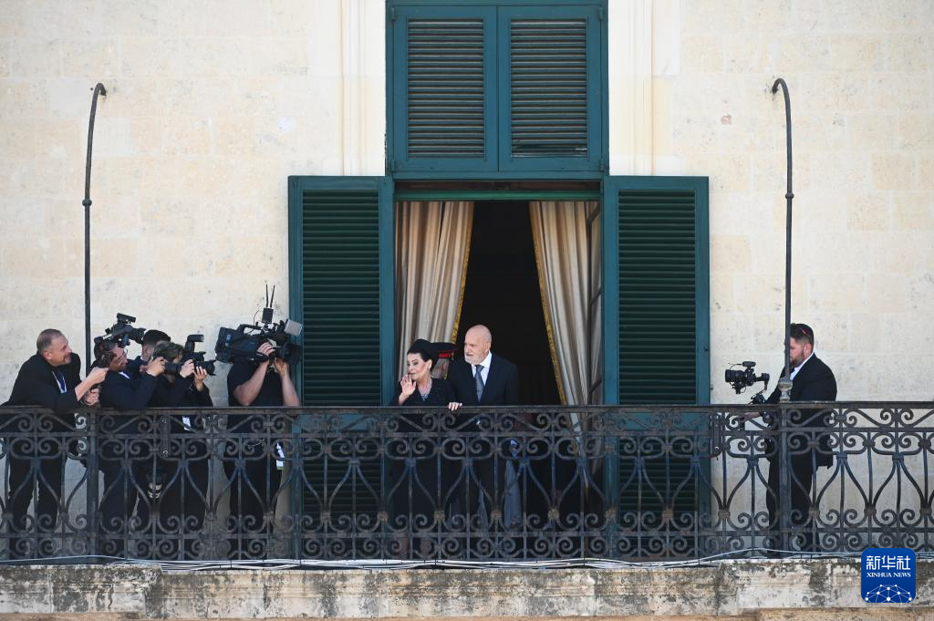 4月4日,在马耳他首都瓦莱塔,马耳他新任总统米丽娅姆·斯皮泰里·德博诺(中左)和她的丈夫在总统府的阳台上向人群挥手。