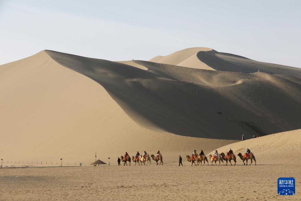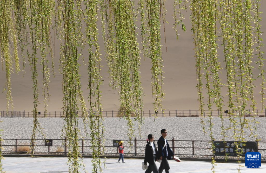 4月4日,游客在甘肃省敦煌市鸣沙山月牙泉景区游玩。