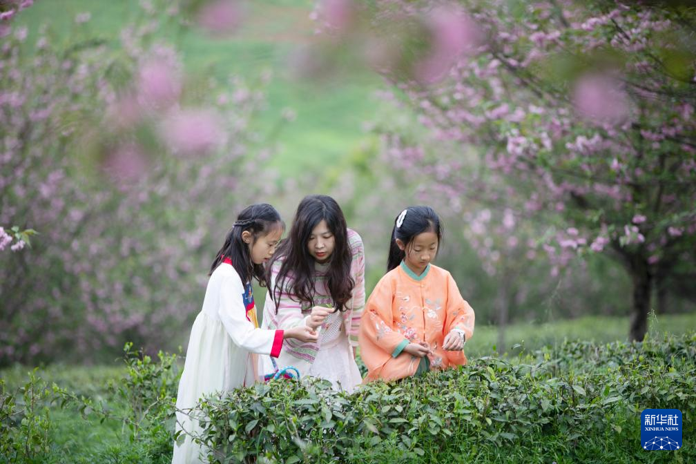 4月4日,人们在重庆市秀山土家族苗族自治县兴隆坳农业园区樱花茶园体验采茶。