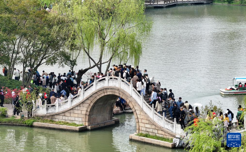 4月4日,人们在江苏扬州瘦西湖风景区游玩(无人机照片)。