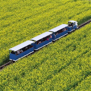 4月4日,在河南省洛阳市汝阳县三屯镇东保村,游客乘坐小火车在油菜花田观光。