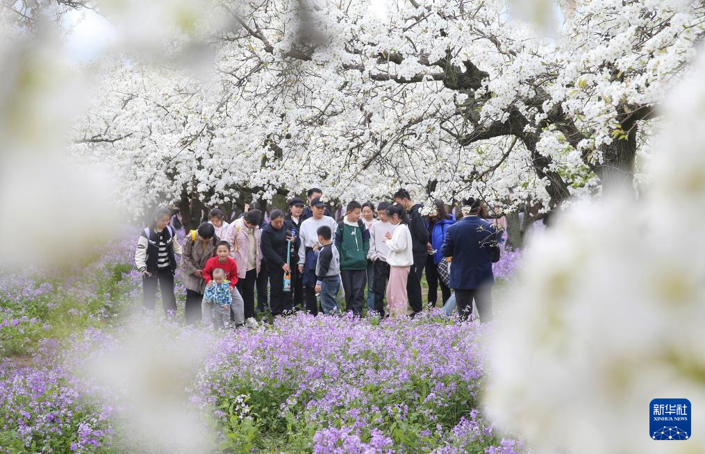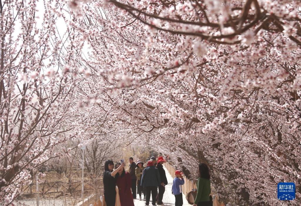 4月4日,在甘肃省敦煌市月牙泉镇月牙泉村,游客在李广杏园中赏花。