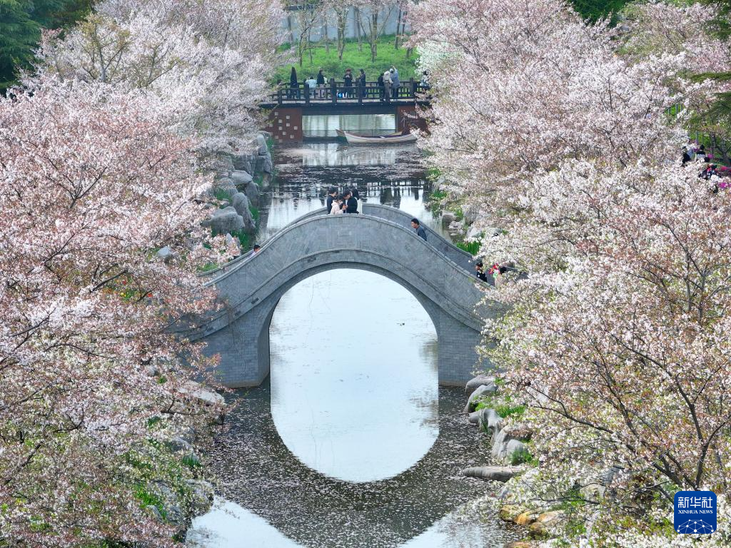 4月4日,游客在江苏省南通市通州区五接镇洲际梦幻岛樱花河游览(无人机照片)。
