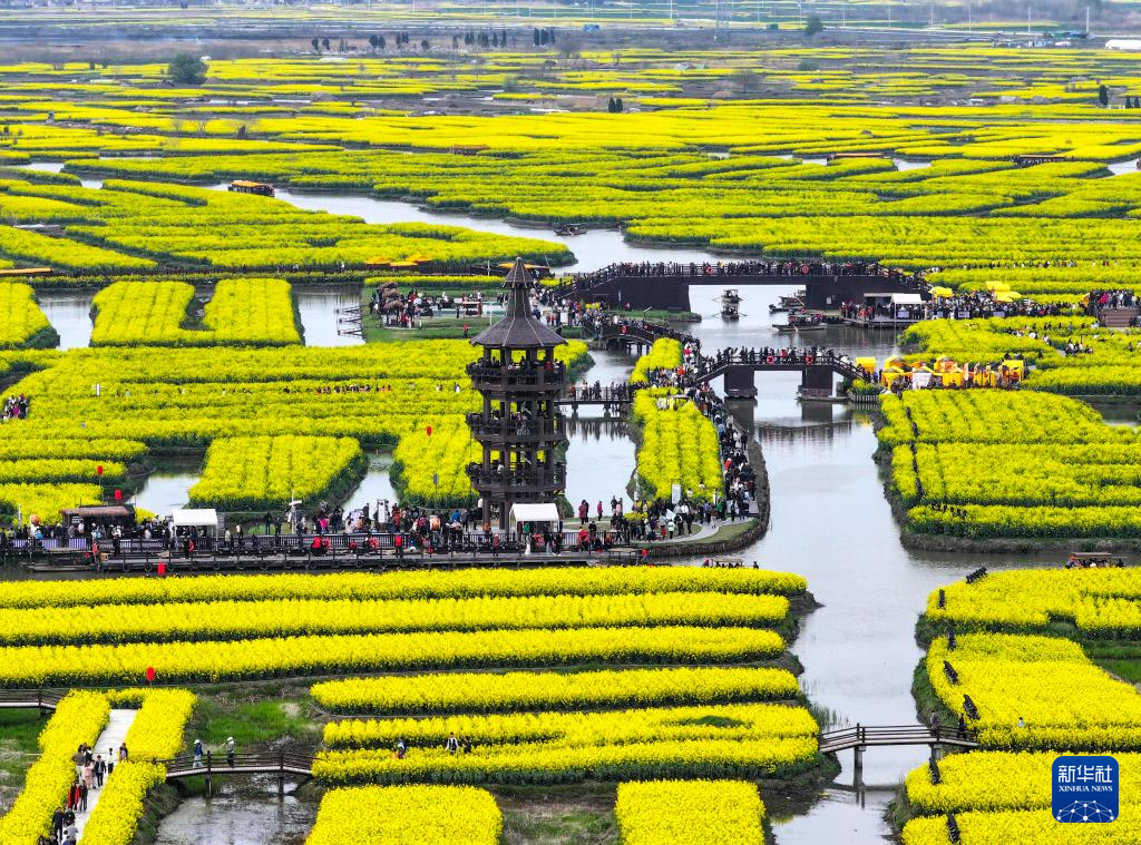 4月4日,游客在江苏省兴化市千垛菜花景区踏青赏花(无人机照片)。