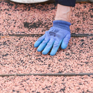 4月4日,在黑龙江北大荒农业股份有限公司友谊分公司一水稻育秧大棚里,农业职工将播下的稻种抚平。