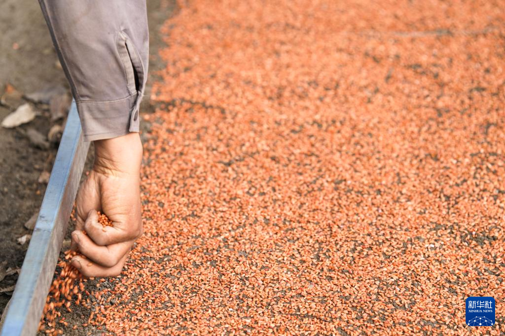 4月4日,在黑龙江北大荒农业股份有限公司友谊分公司一水稻育秧大棚里,农业职工在秧盘边缘处进行稻种补播作业。