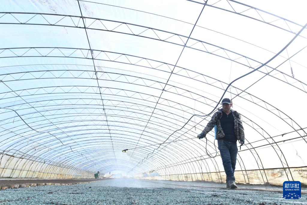 4月4日,在黑龙江北大荒农业股份有限公司友谊分公司一水稻育秧大棚里,农业职工在进行喷药作业。