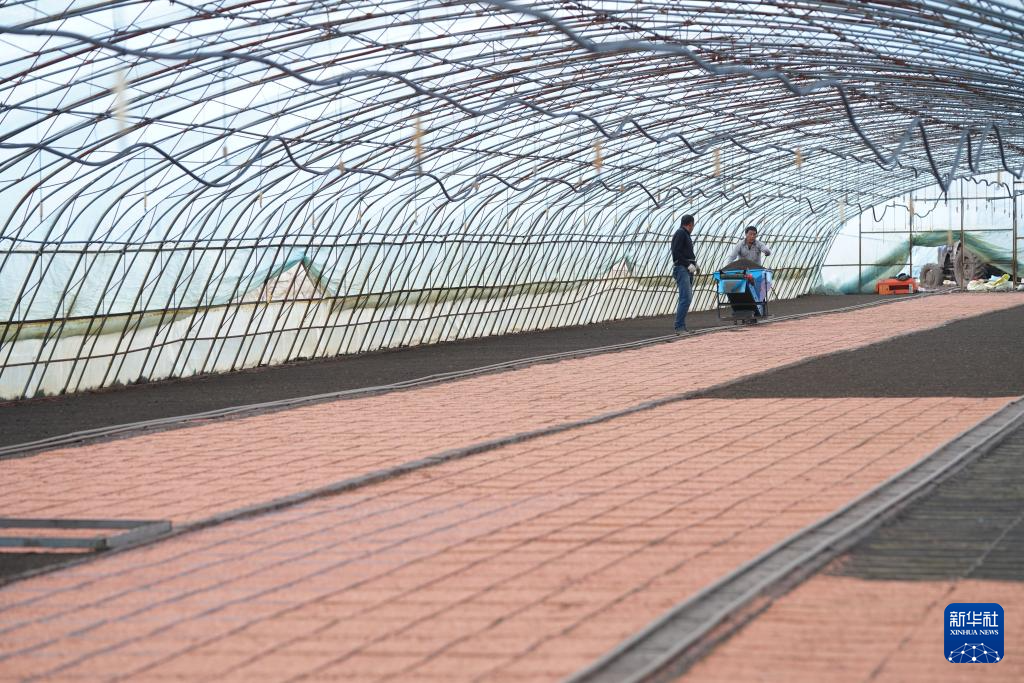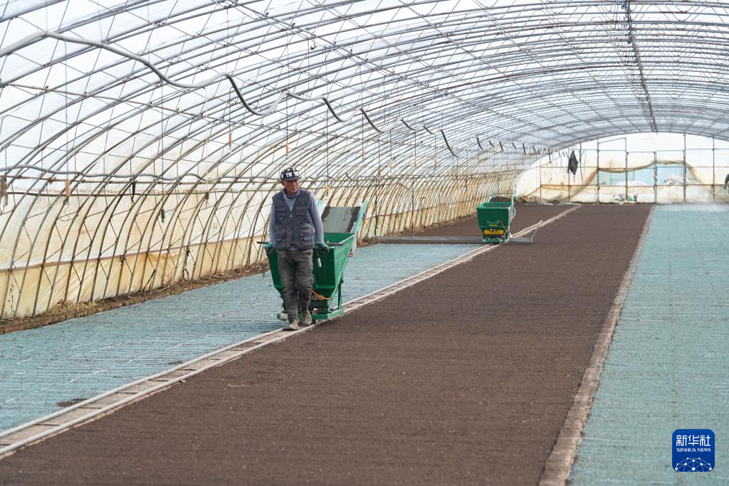 4月4日,在黑龙江北大荒农业股份有限公司友谊分公司一水稻育秧大棚里,农业职工在进行播种后的覆土作业。