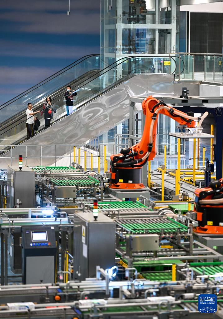 4月4日,游客在呼和浩特市土默特左旗伊利现代智慧健康谷全球智能制造产业园液态奶全球智造标杆基地观看KUKA机械手工作。