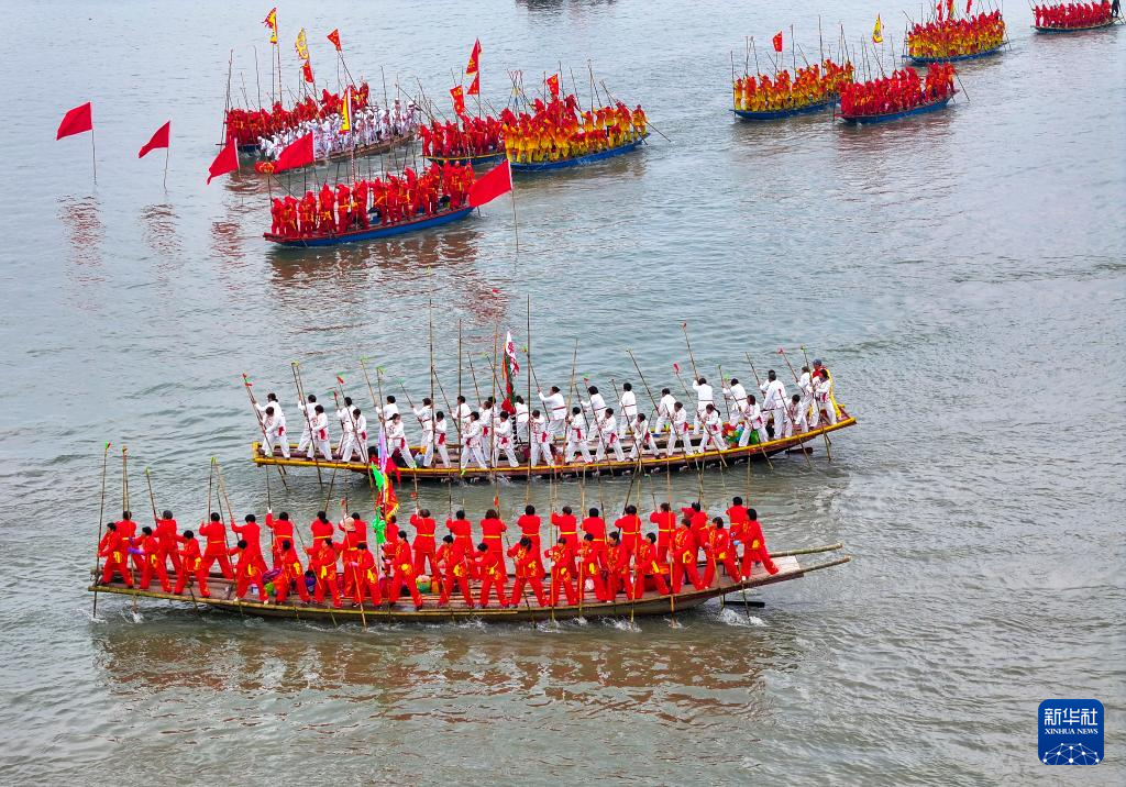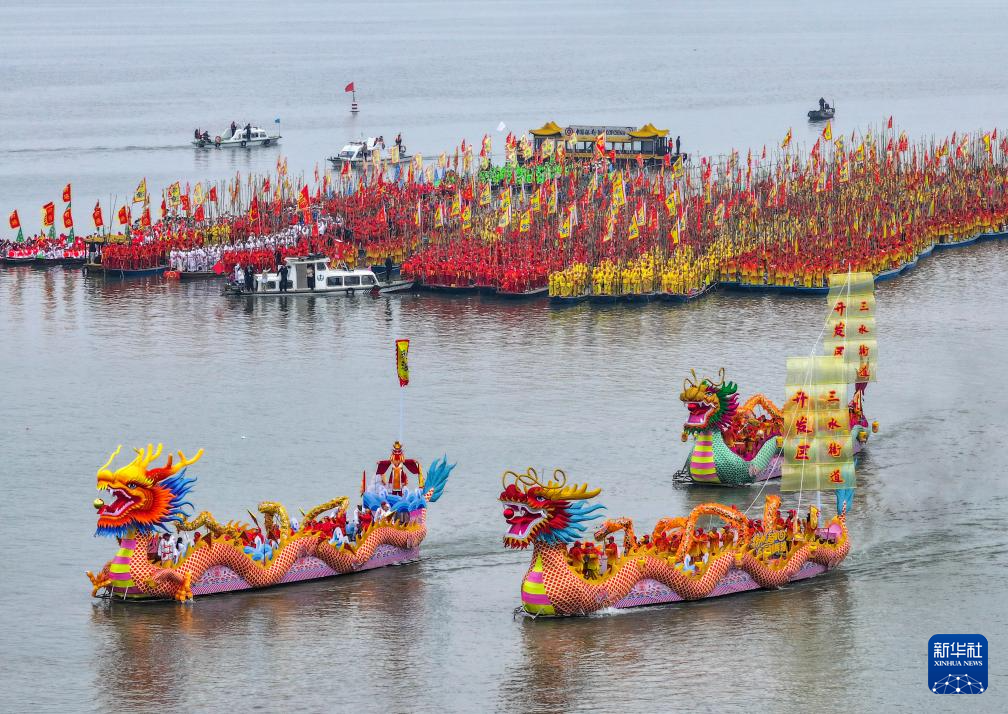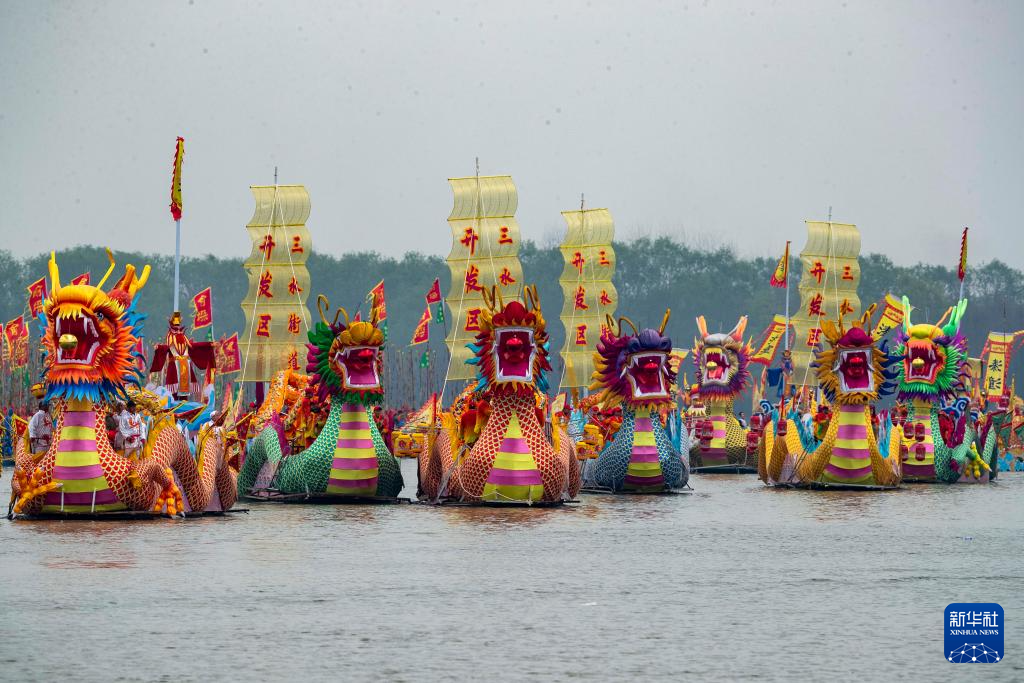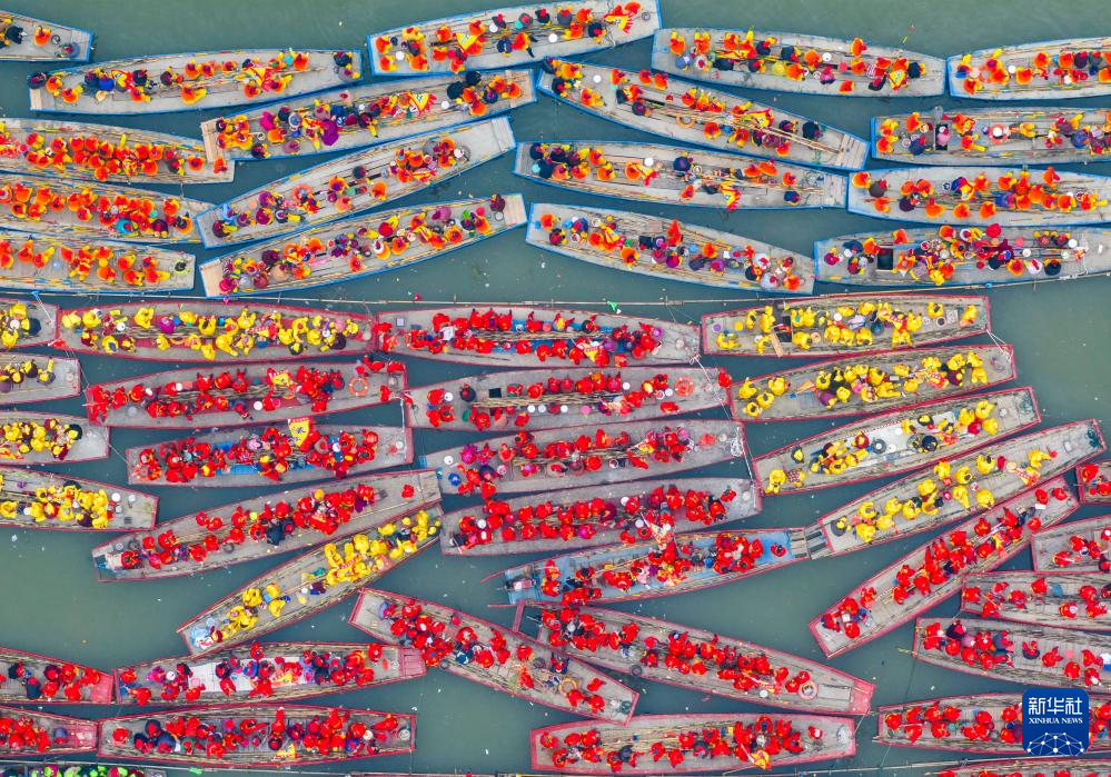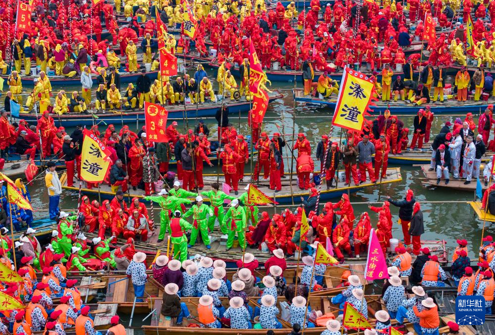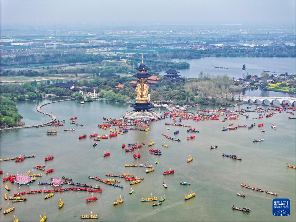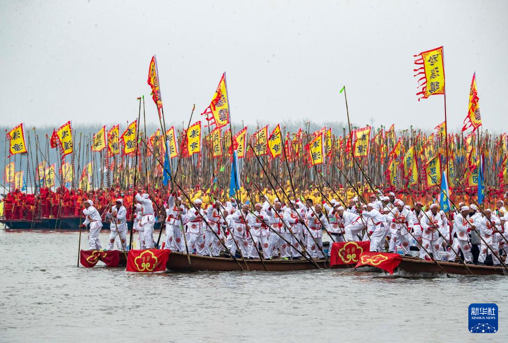当日,2024年泰州姜堰溱潼会船在江苏省泰州市姜堰区溱湖国家湿地公园开幕,数百条各式各样的船只和上万名会船选手云集溱湖,飞篙走桨,奋勇争先,呈现“千篙万桨闹溱湖 百舸争流逐春潮”的壮观场景,演绎历久弥新的民俗画卷。