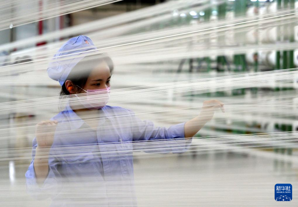 工作人员在中国平煤神马集团帘子布发展公司的布机车间检查丝线情况(3月28日摄)。位于河南平顶山的中国平煤神马集团积极打造煤炭全产业链,普通的煤炭被加工成众多高附加值衍生产品。