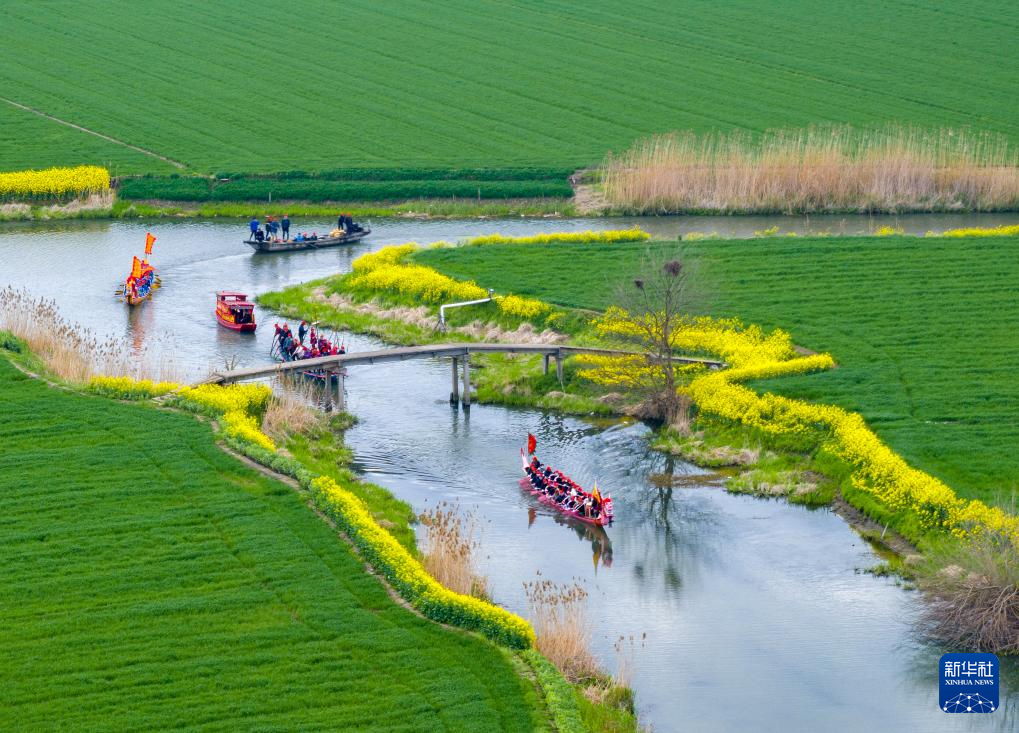 4月4日是清明节,江苏省兴化市举行一年一度的茅山会船盛会。这是船队前往祭祀活动现场(无人机照片)。