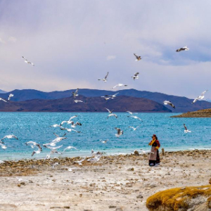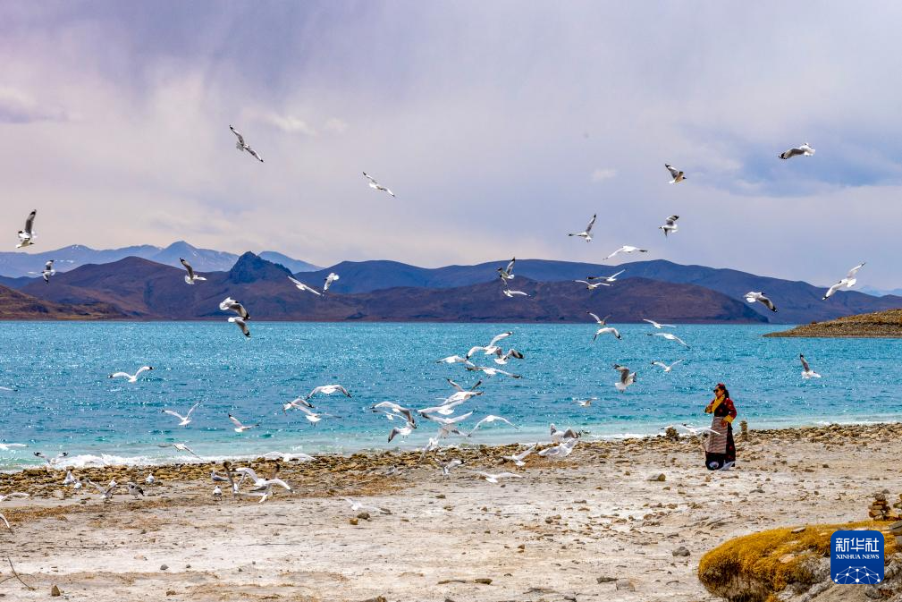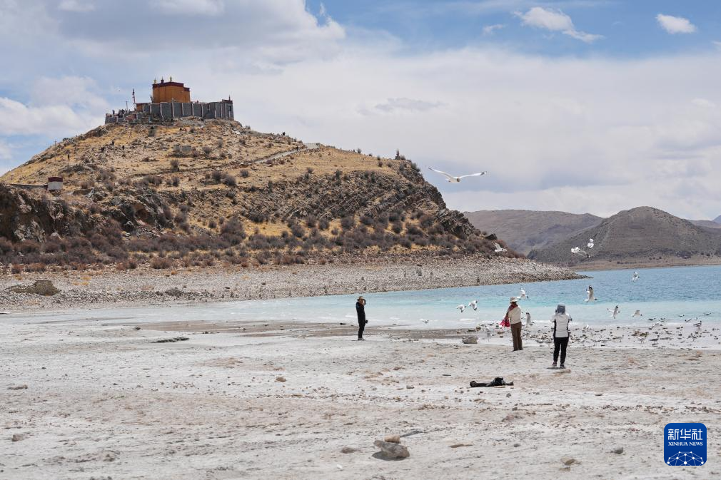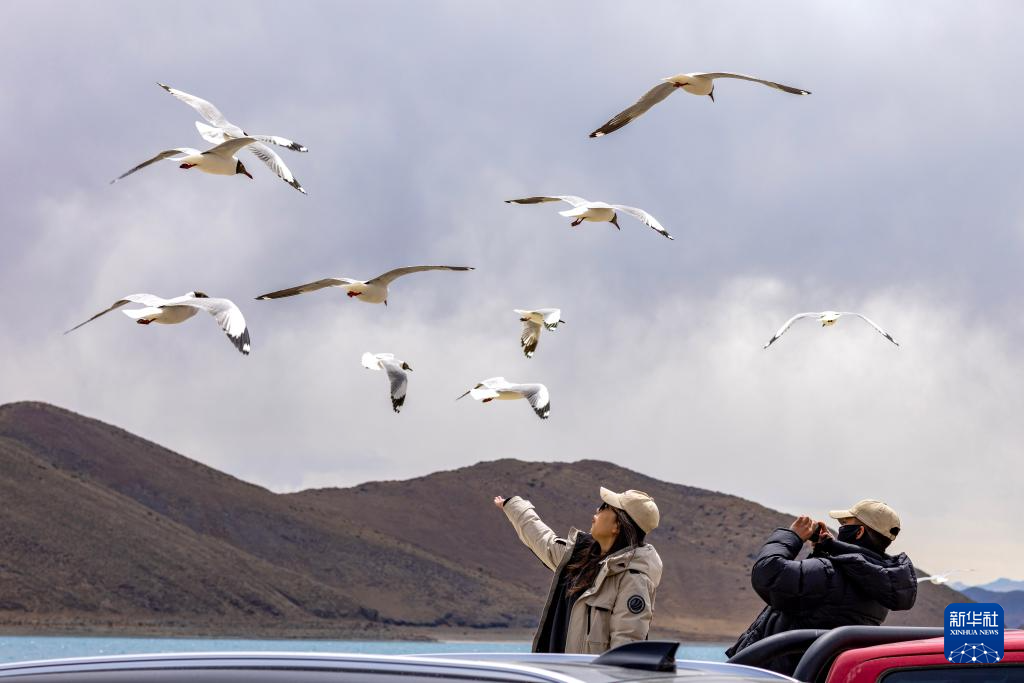 游客在羊卓雍错北岸的日托寺附近投喂棕头鸥(4月5日摄)。