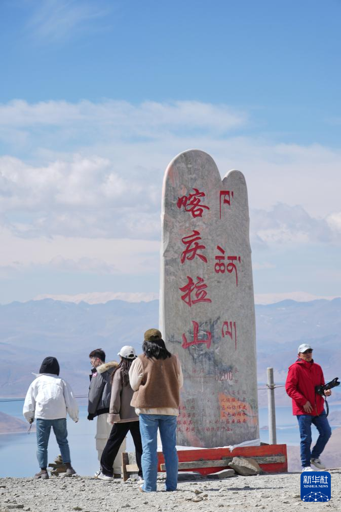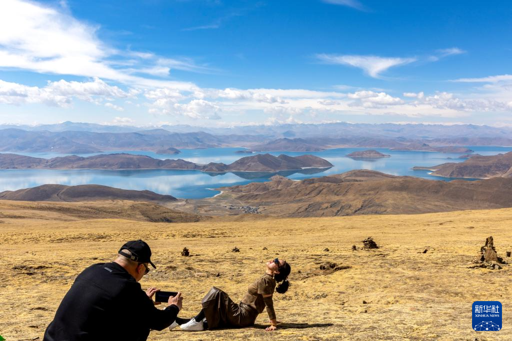 游客在喀庆拉山上以羊卓雍错为背景拍照(4月5日摄)。