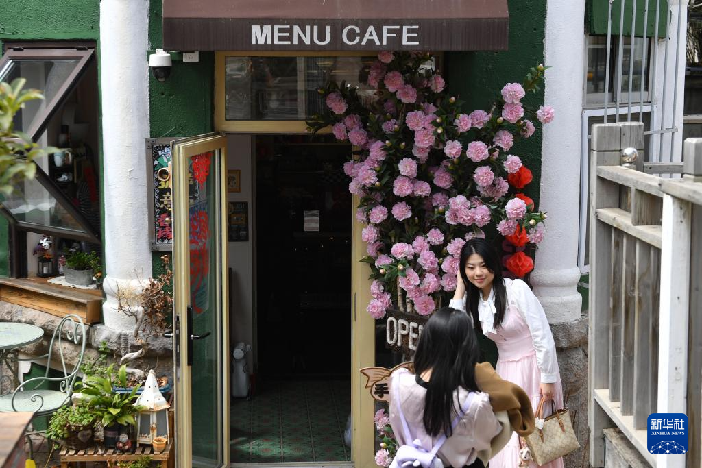 4月4日,游客在青岛市市南区大学路一家咖啡店门前拍照。