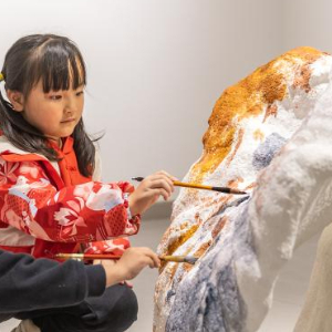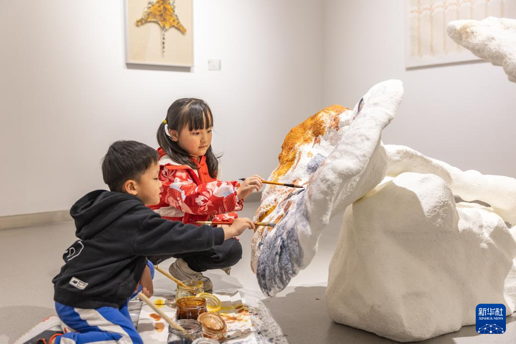4月6日,在“百草创艺”中医药艺术作品展现场,两名小观众在互动体验区用废弃的中药材萃取的颜料绘画。