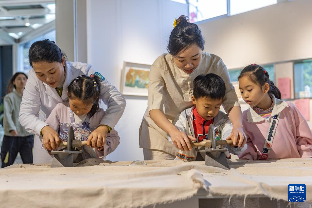 4月6日,在“百草创艺”中医药艺术作品展现场,医生志愿者在指导小朋友研磨中药材。