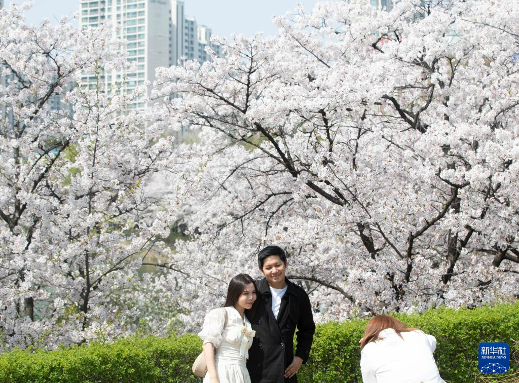近日,韩国首尔天气转暖,樱花陆续开放。