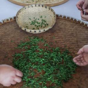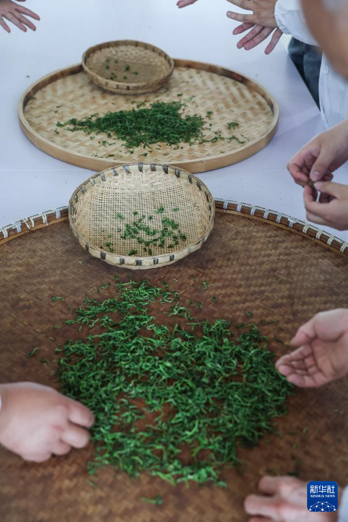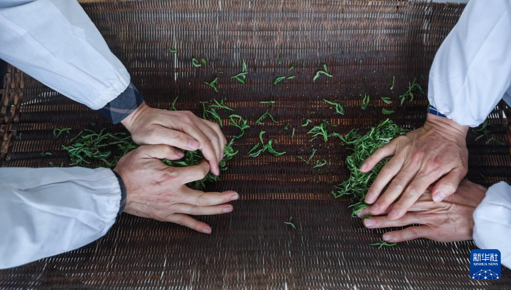 4月7日,在位于浙江金华的浙江采云间茶业有限公司内,制茶师们进行举岩茶的做形工艺。